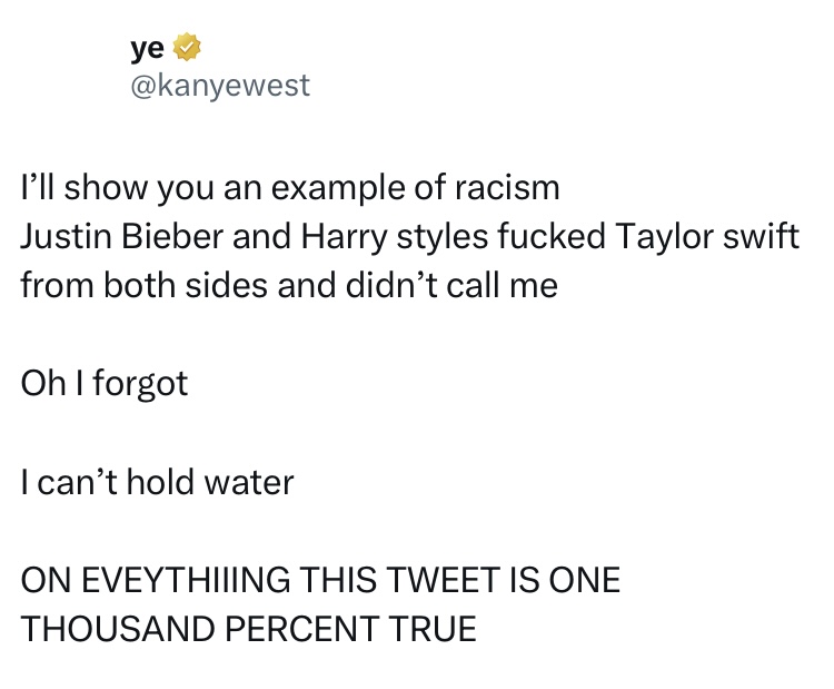 « Je vais vous montrer un exemple de racisme. Justin Bieber et Harry Styles ont baisé Taylor Swift des deux côtés et ne m'ont pas appelé », a-t-il écrit, avant d'ajouter: « Sur chaque tweet, c'est mille pour cent vrai. »