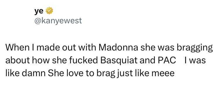 « Quand je me suis fait avec Madonna, elle se vantait de la façon dont elle a baisé Basquiat et Pac. J'étais comme putain, elle adorait se vanter comme meee », a-t-il déclaré à propos de la reine de la pop, avec qui il a récemment été repéré en faisant la fête en 2022.