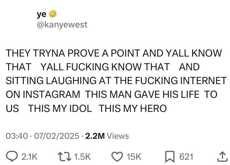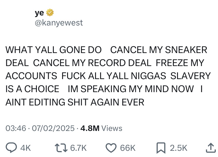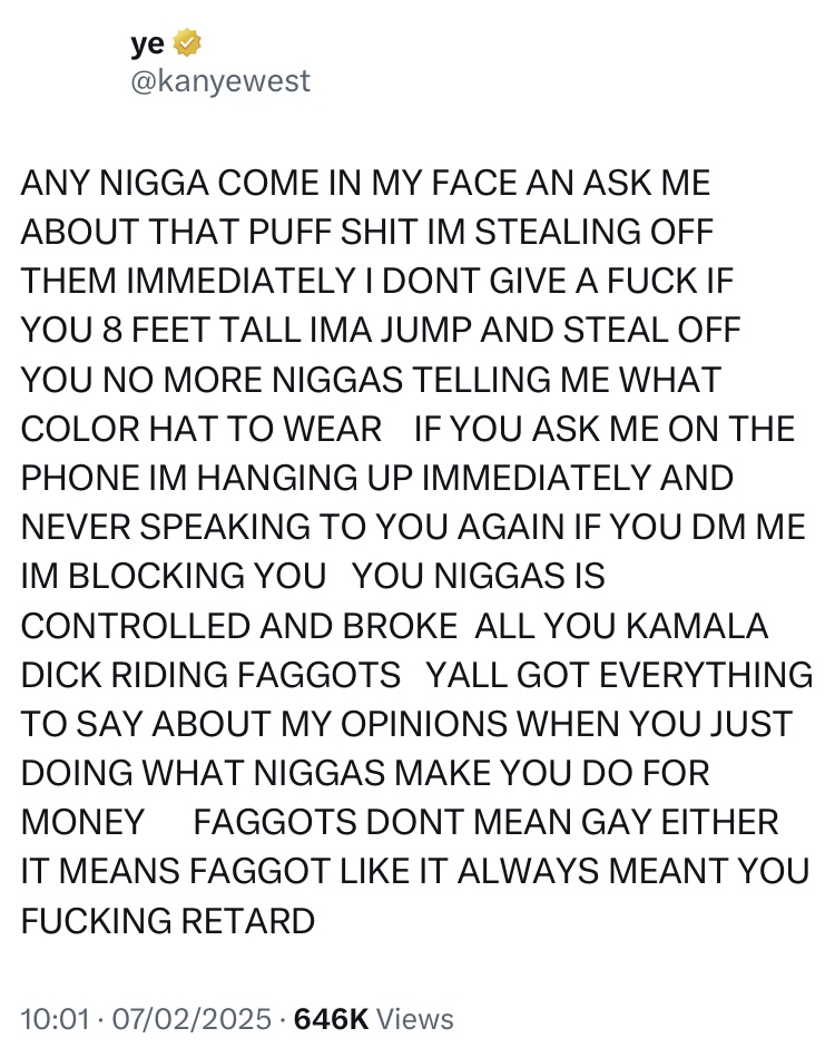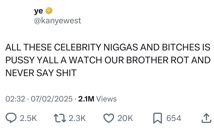La grêle des tweets de Yeezy a commencé avec le message simple «bouffée libre», avant de dire: «Toutes ces N-Ggas et Bitches de célébrités sont la chatte. Yall A Watch Our Brother Rott et ne dites jamais de la merde.