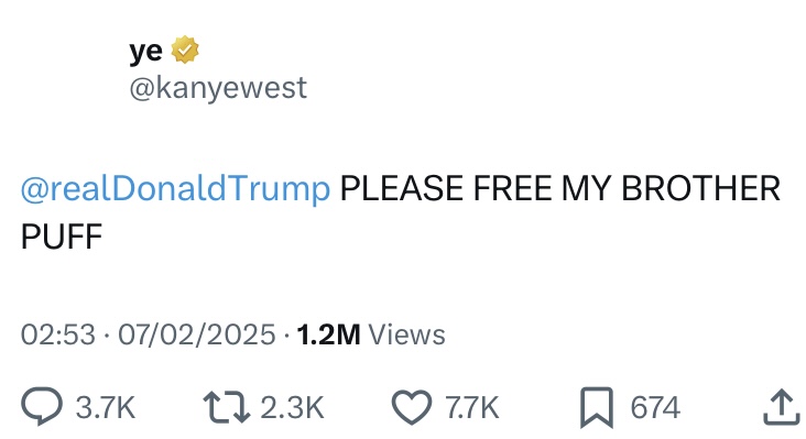 Il a ensuite marqué Trump, pour qui il a récemment réaffirmé son soutien et a écrit: « S'il vous plaît libérer mon frère Puff. »
