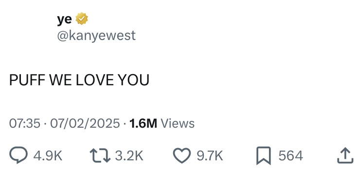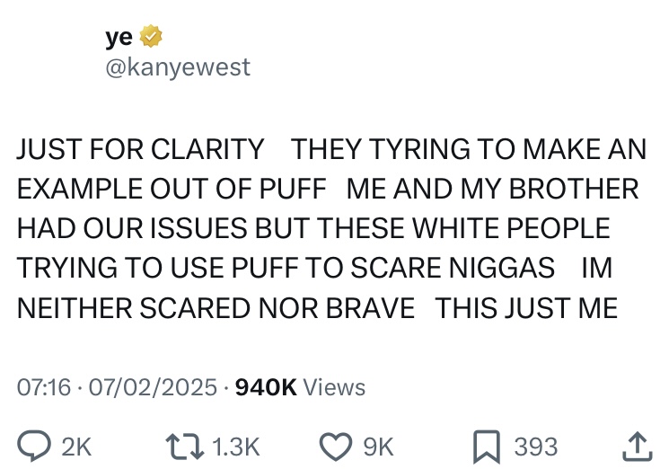 Quelques heures plus tard, Kanye a repris sa diatribe et a écrit: «Juste pour plus de clarté, ils Tyring pour faire un exemple de bouffée. Mon frère et moi avons eu nos problèmes, mais ces Blancs essayant d'utiliser Puff pour effrayer les N-Ggas. Je ne suis ni effrayé ni brave ça juste moi.