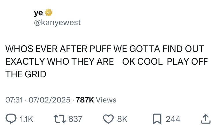 Le fondateur de Good Music a également semblé suggérer que l'arrestation de Diddy faisait partie d'une conspiration contre lui: «Quiconque après Puff, nous devons découvrir exactement qui ils sont. Ok cool jouer sur la grille.