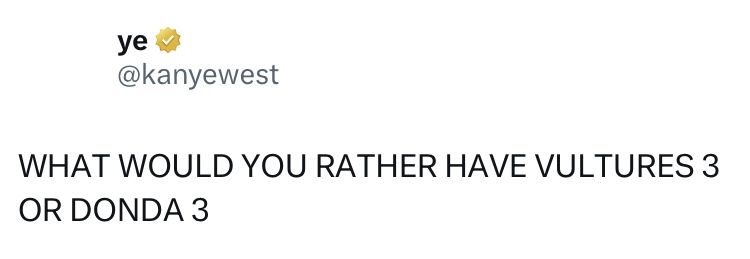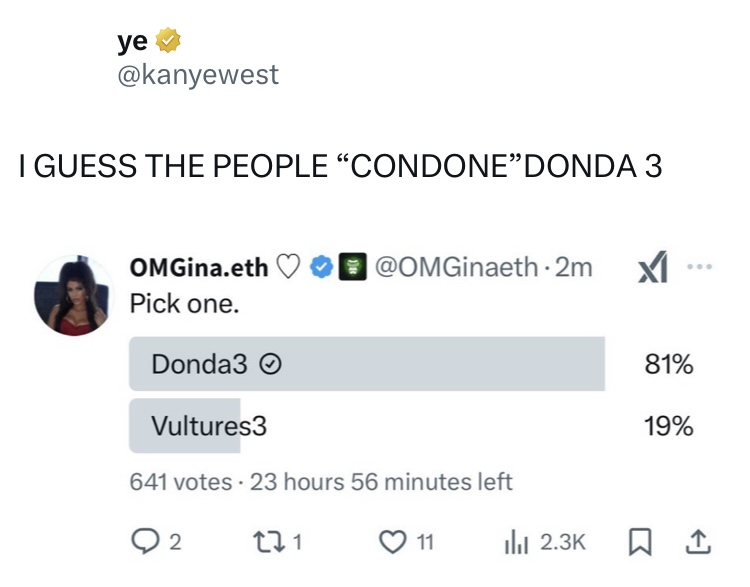 Kanye a alors demandé aux fans s'ils préféreraient Donda 3 ou un troisième Vultures Album avec Ty Dolla $ IGN, le premier arrivant en tête dans un sondage.